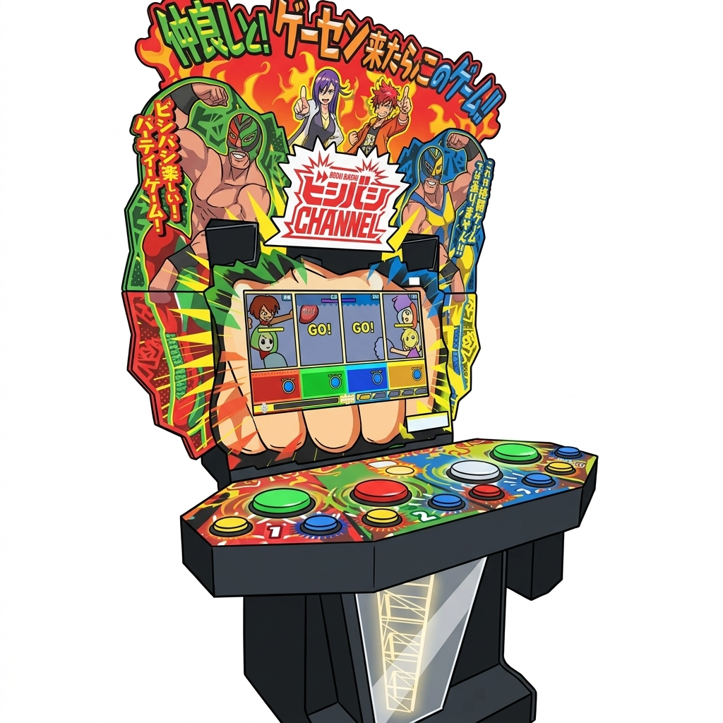 The Konami Bishi Bashi arcade cabinet is a cheerful multiplayer cabinet for party minigames, supporting 1-4 players (or up to 6 when linked).